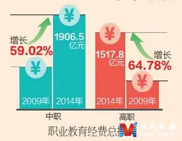 2014年,職業(yè)教育經(jīng)費(fèi)總投入3424億元,比2010年增長(zhǎng)了42.2%