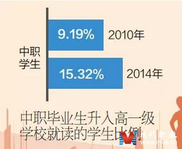 2014年6月底,國(guó)務(wù)院下發(fā)了關(guān)于加快發(fā)展現(xiàn)代職業(yè)教育的決定。提出“到2020年,形成適應(yīng)發(fā)展需求、產(chǎn)教深度融合、中職高職銜接、職業(yè)教育與普通教育相互溝通,體現(xiàn)終身教育理念,具有中國(guó)特色、世界水平的現(xiàn)代職業(yè)教育體系”。